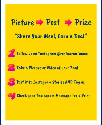 A chatbot automatically sends a digital coupon to their Instagram DMs just seconds after they post and tag your page.That Story — with your restaurant’s Instagram link — is seen by their followers for 24 hours. That’s a warm audience who already trusts the person posting.Some of those followers will click through to your Instagram profile.This results in warm audience traffic.The prizes are set by you. We suggest 5-10 prizes with different percentage chances of winning to keep it fun.